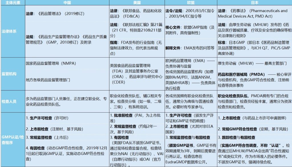 不同经济体的 GMP 法律依据呈现 “强制核心 + 配套细则” 的共性,但具体构成各有侧重: